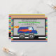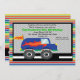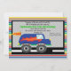 Start your celebration off with this perfect Monster truck invite. Make that special boy's birthday a memorable one! This is a bright blue truck with orange flames across the side. it has large, big black tires. It's on a street. It has a chequered silver background with a black border. The outside of this invitation has a multi coloured thin stripes. Personalise it with your party information. Check out the many other products and colours in this line. © JW Illustrations