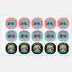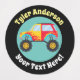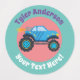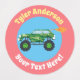 Colourful Monster Trucks 2 with personalised name and message on orange, teal and black backgrounds with peach, blue and teal centre circles. Use to keep kid's items from getting lost, or for decorating your stuff.
