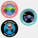 Colourful Monster Trucks with personalised name and message on orange, teal and black backgrounds with blue and black centre circles. Keep kid's items from getting lost.