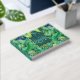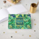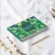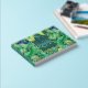 A beautiful green, golden yellow and dark blue seamless pattern comprising of monstera jungle leaves that has a dark faux shimmer teal blue square inlay on the front cover on which a text template for your custom wording reads "guest book" on the front and another on the spine is for your personalised. Both text templates are real foil creating a timeless and luxury look to the cover.