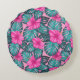 Monstera leaves and Hibiscus Teal and Pink on Pink Round Cushion