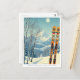 Hello from the snowy mountains of Mont Tremblant Quebec Canada! We hope you're having a wonderful ski vacation. This postcard features a gorgeous blue-grey mountain landscape with retro ski boards in an orange tribal pattern.