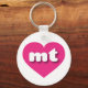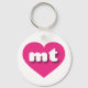 This key chain features a vibrant hot pink heart containing the bold, rounded, white lower case letters mt, a playful abbreviation for Montana, the treasure state.