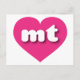 This postcard features a vibrant hot pink heart containing the bold, rounded, white lower case letters mt, a playful abbreviation for Montana, the treasure state. The reverse side of the postcard is blank, awaiting your customised text or handwritten sentiments.