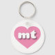 This keychain features a vibrant pink heart containing the bold, white, rounded lower case letters mt, a playful abbreviation for Montana, the treasure state.