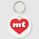 This key chain features a vibrant red heart containing the bold, white, rounded lower case letters mt, a playful abbreviation for Montana, the treasure state.