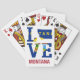 Montana state love. Montana in bright red uppercase sans font. The word love is filled with the state flag and the letter O in love is shaped in the silhouette of the state.