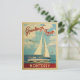 This Greetings From Monterey California vintage travel nautical design features a boat sailing on the water with seagulls and a blue sky filled with gorgeous puffy white clouds.