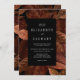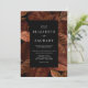 This modern botanical invitation features a dark, moody background of autumn leaves in shades of rust. Personalise it with the names of the bride and groom and other wedding details in white on a black rectangle. The image of rust leaves is repeated on the back of the card. Ideal for a fall wedding!