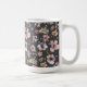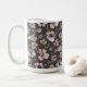 Moody Boho Watercolor Blush Wildflowers Pattern Coffee Mug to start your day right. A perfect gift for someone who loves a moody romantic vibe. Coordinating with a range of home decor products using the same design and colors, this moody, dramatic botanical pattern features lush watercolor wildflowers in soft blush, lavender, and peach hues, set against a deep charcoal grey background. The high-contrast design captures the spirit of Dark Academia and Maximalist decor, offering a sophisticated, luxurious touch for your home decor. The painterly style and rich color palette ensure a beautiful, high-end look."