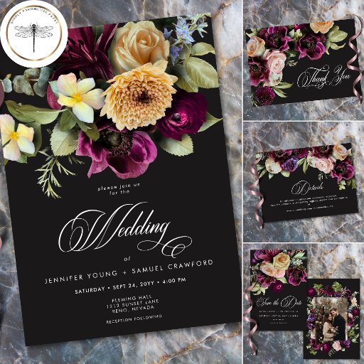 Moody Dark Floral Black Burgundy Romantic WeddingDesigned by Kathe Santillo