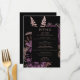 This elegant, moody wedding menu features a lush, romantic floral bouquet in purple with rose gold faux foil and glitter foliage on a black background. Customise the rose pink text in stylish fonts on a black rectangle. The back of the card is solid black.