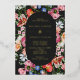 A moody and classy wedding invitation with multi-colour watercolor Dutch still life flowers surrounding a pill frame, on charcoal background. All text is in gold foil. The reverse features a pattern of flowers.