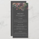 An elegant wedding menu in a dark colour scheme of dark grey and white with watercolor flowers in eggplant purple, rusty orange and green leaves. Personalise with your names and wedding date.