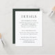 Complete your wedding suite with this moody forest green details card, featuring rich dark green tones and elegant minimalist typography. Perfect for sophisticated, modern, woodland, rustic, or nature-inspired weddings, this design provides space for accommodations, directions, reception information, and special notes. The refined layout pairs beautifully with any moody green or forest-themed wedding invitation. Fully customizable and print-ready, offering a polished finishing touch to your stationery set.