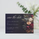 This stunning dark gothic wedding save the date card features a luxurious moody and slightly withered floral arrangement in deep jewel tones over a black background. Perfect for a mysterious and romantic fall or winter ceremony. This dramatic design is ideal for couples seeking a non-traditional, opulent or vintage style. Created by Simply Farmhouse Press.
