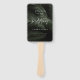 Moody Tropics, wedding program hand fan. Dark tropical palm frond photography. Features, white typography design style mix of edgy script and bold type.