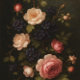 A richly detailed Old Masters–inspired floral painting featuring heirloom roses and deep indigo blossoms set against a shadowed background. Soft classical lighting enhances the velvety petals and muted greenery, creating a timeless, romantic composition.