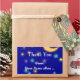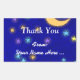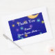 A custom Thank You sticker with white script and italic letters and elegant vintage art of a glowing moon and colourful stars on an etched blue background.
