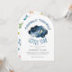 This baby shower invitation features a moon and stars theme, is ideal for a simple celebration. The modern whimsical design showcases a navy-blue watercolor cloud shape adorned with a yellow crescent moon and scattered stars.