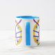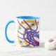This mug features an ornate complex pattern in shades of blue, magenta and gold. Abstract elemental objects are scattered throughout: suns, moons and curving trajectories.