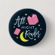 A bookish button featuring the words "All Night Reader" surrounded by yellow moon and stars and pink books against a dark blue background.
