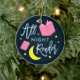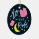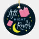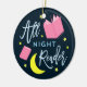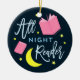 Perfect for book lovers, this lovely bookish ornament features the words "All Night Reader" surrounded by yellow moon and stars and pink books against a dark blue background.