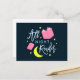 Perfect for book lovers, this bookish postcard features the words "All Night Reader" surrounded by yellow moon and stars and pink books against a dark blue background.