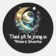 A wonderful and vibrant golden and pale blue crescent moon with ornate detail on it frames a full waning moon that has sparkling blue stars below it set against a midnight black background that may be changed to any colour of your choice. Ideal on wedding favour gifts at a moon and stars wedding; for your special starry night themed anniversary or for any wiccan business; lodge or resort.