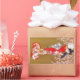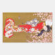 Vintage Oriental art features a lovely lady standing beneath the pink cherry blossoms with a full moon peeking through the flowering branches. Little butterflies fly overt the gold background.