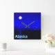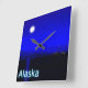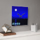Moonrise in the Inside Passage off the coat of Alaska. Mountains in the distance and a fishing boat heads north. Text reading "Alaska" appears in glowing blue and white.