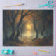 A baroque-style painting of a mysterious forest path bathed in moonlight, where crooked trees arch overhead and mist drifts through the golden autumn leaves.