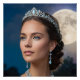 A three-quarter portrait of a beautiful woman illuminated by a moonlit cyan and golden glow. She wears an elegant silver tiara adorned with shimmering white moonstones, cascading moonstone earrings, and an ethereal bib necklace with a subtle rainbow sheen. Her midnight blue gown complements the soft twilight sky and starlight in the background, creating a serene, magical atmosphere.