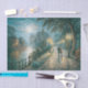 Moonlit couple walking riverside path decoupage featuring a couple strolling beneath glowing street lamps along a quiet river under a luminous moonlit sky. Soft reflections on the water and a peaceful evening atmosphere create a romantic European scene perfect for furniture art, cabinets, dressers, trays, and decorative craft projects.