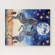 A romantic image with a fantasy feel of two zebra on their hind legs dancing under a big full moon with exaggerated illustrated stars in the night sky.
