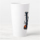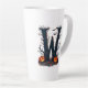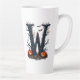 A striking Halloween illustration featuring a spooky, oversized letter 'W' formed from dark, gnarled tree trunks and branches. The 'W' is silhouetted against a bright, ominous orange full moon, with two black bats flying across the light. At the base, two grinning jack-o'-lanterns sit among scattered orange leaves and wispy grass, adding a warm glow to the dark, eerie composition.