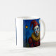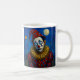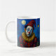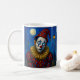 Glossy porcelain-style Pierrot clown with red polka-dot costume under moonlit street on mug, ideal for collectors or artistic gifts. This unique mug features a glossy porcelain-style Pierrot clown set against a misty moonlit street. With a sorrowful expression, painted teardrops, and a bright red nose, the clown wears a pointed hat and a richly textured ruffled collar. His red costume with blue polka dots glows under the lamplight, enhanced by a smooth ceramic effect that brings every detail to life. Perfect for coffee, tea, or as a decorative piece, this mug makes a striking gift for art collectors, circus enthusiasts, or anyone who loves moody, theatrical designs.