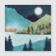A beautiful landscape with unique textures showing a mountain lake landscape with a rising moon and starry sky in shades of blue, gold, green, and turquoise.