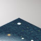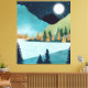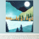 A beautiful landscape with unique textures showing a mountain lake landscape with a rising moon and starry sky in shades of blue, gold, green, and turquoise.