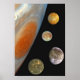 This beautiful poster print for space buffs features images of the planet Jupiter and its four largest moons, known as the Galilean satellites. From top to bottom, the moons shown are Io, Europa, Ganymede and Callisto. Jupiter’s Great Red Spot – a storm in Jupiter’s atmosphere – is clearly visible on the planet. The Red Spot is at least 300 years old, and winds blow at an astonishing 250 miles per hour. With the exception of the glittering portrait of Callisto which is from NASA's Voyager spacecraft, all the images were captured by NASA's Galileo spacecraft. Image credit: NASA