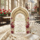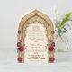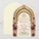 Celebrate your union with elegance featuring a traditional Islamic archway, deep burgundy roses, and the Bismillah in ornate calligraphy for a timeless Nikkah.This design features a sophisticated central layout dominated by a visually textured multifoil archway inspired by Moorish architecture, rendered in a faux carved beige stone effect. At the apex sits the Bismillah in formal Arabic calligraphy, framed by intricate geometric detailing. The structure is softened by clusters of vintage-style watercolor roses in deep burgundy and dark red, accented with muted brown and sage greenery. The typography hierarchy utilizes a classic serif font in dark charcoal against a warm cream background, creating a formal and legible aesthetic.