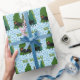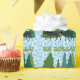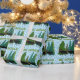 Silhouetted bull moose and elk wearing red and white Santa hats strolling through the forest. Seamless repeating snowflakes in blues and teal create a wintery backdrop. Text reads, "Be Jolly." Whimsical art by Melissa J Barrett