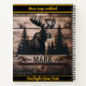 A beautifully crafted moose appears against a rustic wooden backdrop, framed by silhouettes of pine trees, creating a stunning display that highlights nature’s beauty and craftsmanship.