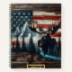 A stunning moose stands proudly against a backdrop of mountains and an American flag, surrounded by towering trees and tranquil waters.