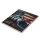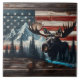A moose head emerges from a rustic wooden backdrop featuring the American flag, mountains, and pine trees, celebrating nature and patriotism.