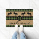 Fun doormat with contemporary black and green chequered plaid pattern on burlap background. Stylish rustic unique design with room to customise or personalise with your family name monogram. Original personalised monogrammed outdoor decor accent for decorating the front porch or yard of your country cottage house, log cabin, mountain lodge, fishing camp, lake or river vacation home.