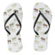Cute random pattern Moose flip flops in earth tones with a white background.