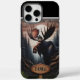 A wooden sign with a painted image of a moose with large antlers. The sign is in front of a forest, and the moon is visible in the background. The name Thomas is written on the sign.