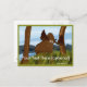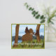 A moose gives a surprised look in this outdoor themed postcard. Mountains and a lake are in the background.