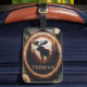 A wooden sign carved from a tree trunk features a silhouette of a moose in a forest setting. The name Thomas is written below the moose.